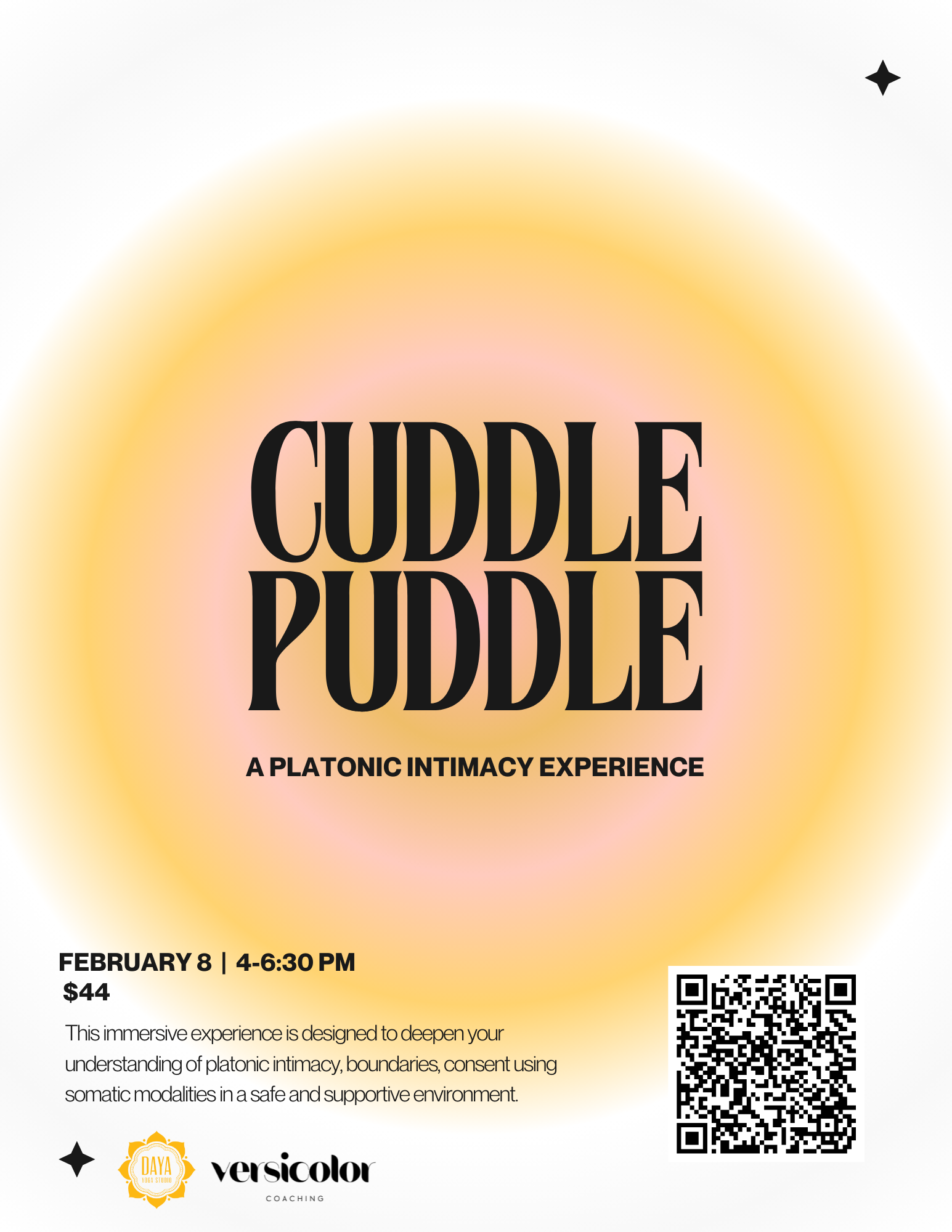 Facilitated by an experienced somatic practitioner, Jessica Langley, "Cuddle Puddle" offers a space for individuals to explore their relationship with touch, consent, and embodiment. You'll learn practical techniques for communicating boundaries, recognizing and respecting the boundaries of others, and embodying consent in every interaction.