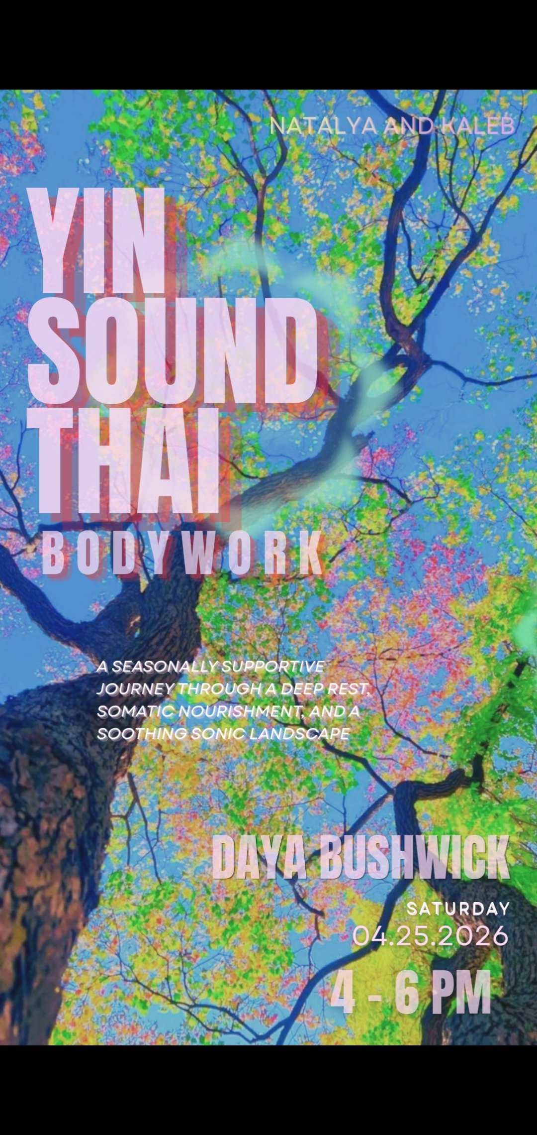 After our yin practice, Kaleb will offer Thai bodywork for all participants, bringing them into a deeper state of restoration. Meanwhile, Natalya will lead a soundbath incorporating crystal singing bowls, harmonium and mantra, ambient electric guitar, Tibetan bowls, and more.