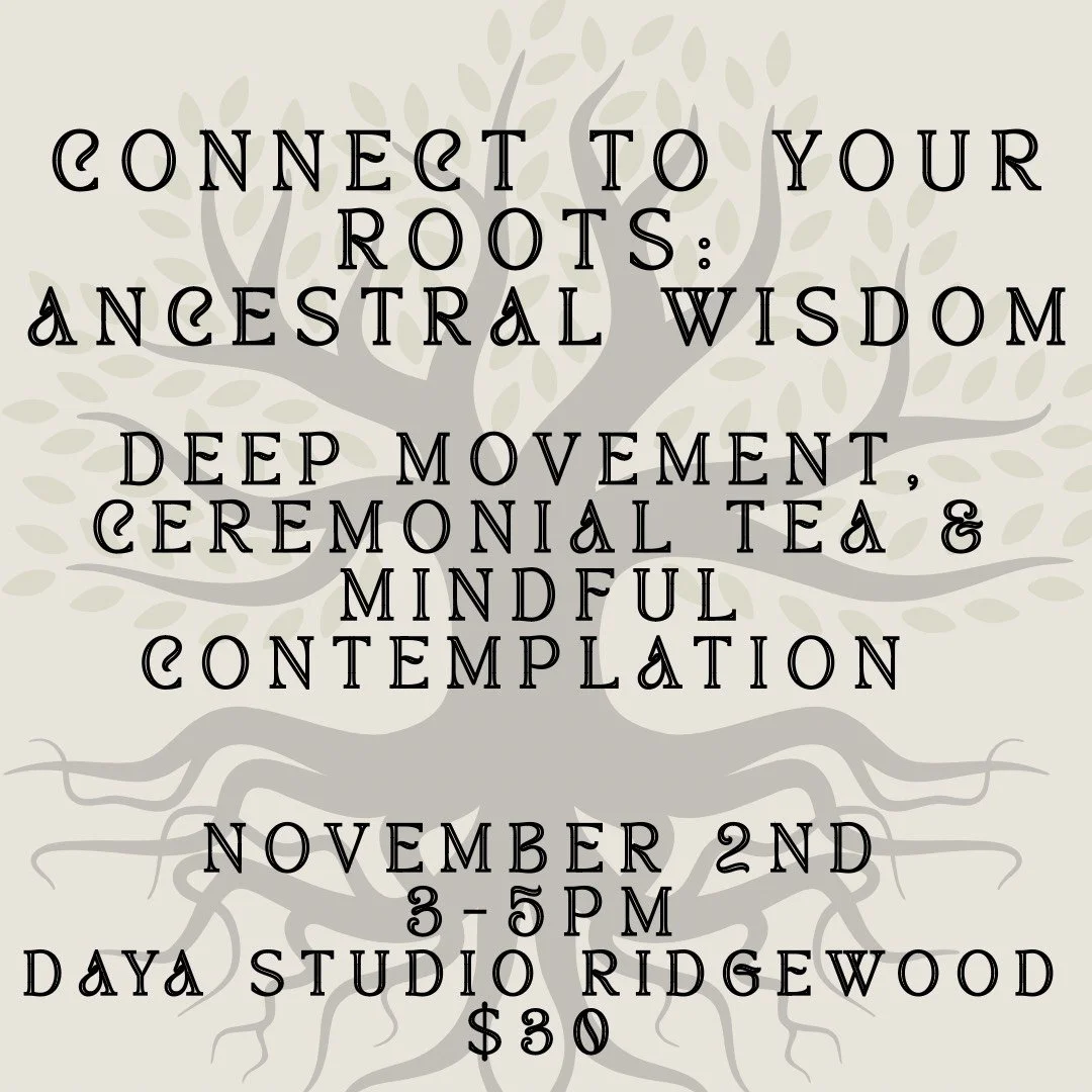 Join me as we begin our journey of self reflection through connection to our Ancestors and grief. We will use movement, Ceremonial Tea, silent contemplation and journaling to dig deep, shed our dry leaves and find new space for growth.