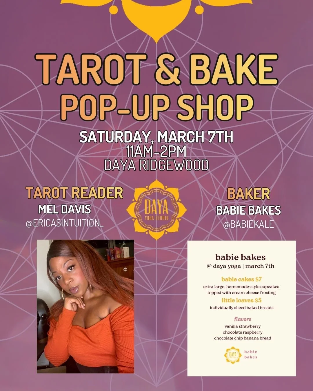 Stop by Daya Ridgewood between 11am-2pm on Sunday, March 7th for tarot readings and baked goods!