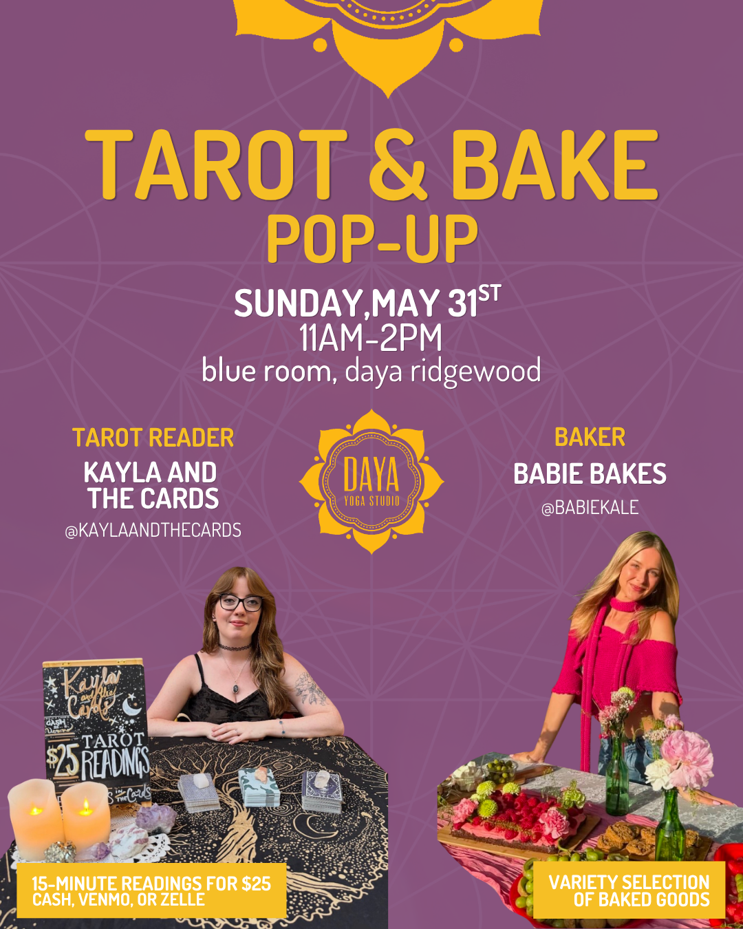 Back to All Events Tarot and Bake Pop-Up Sunday, May 31, 2026 11:00 AM 2:00 PM Daya Ridgewood (map) Google Calendar ICS Tarot and Bake Pop UpSunday, May 31st11am-2pmblue room, daya ridgewoodJoin Kayla and the Cards for 15-minute readings or checking out Babie Bakes selection of baked goods during this time frame at our collab pop-up shop. Swing by Daya Ridgewood then!